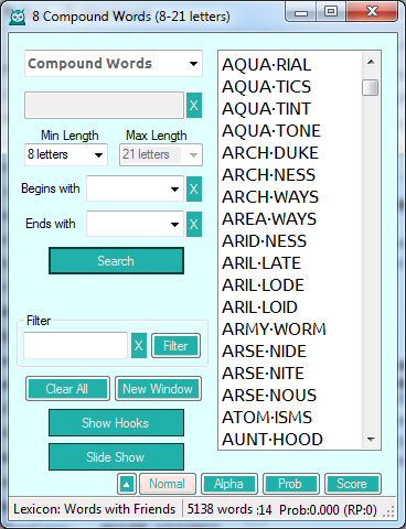 Searching for compound words is as simple as selecting the word length and pressing Search. The results can be displayed with the two words separated by a bullet, such as HIGH•WAYS, HIGH•TOPS, and HILL•TOPS. You can search for words of any length longer than 3 letters. You can even search for 14 letter words composed of two seven-letter words. COUNTER•MEASURE is one of them. Incidentally, the word COUNTER-COUNTER-MEASURE is composed of three seven-letter words. That would be a fun sequence of plays in Superscrabble. Of course you can limit the search based on prefix/suffix also.