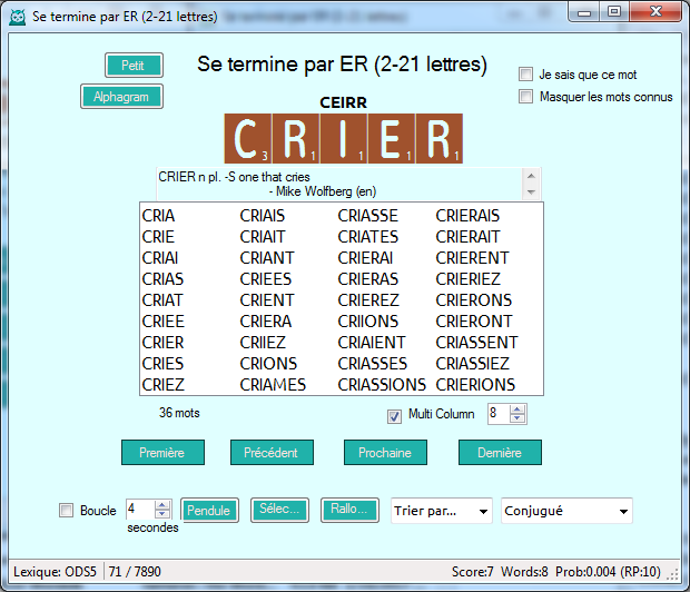 Another search in Combination is the pattern search. This is pretty easy to use for basic searches. E* would find words beginning with the letter E. ???? would show all of the four letter words. In Hoot, you can even use c, v, or numbers for letter sets. The lowercase c stands for consonant, the lowercase v for vowel, and numbers for the letter value. cc* would find words beginning with two consonants. ???8 would find four letter words ending in a 8 point letter (APEX, HADJ). Of course, you could build your own letter set. ???[WYZ] would find four letter words ending in W, Y, or Z. *(Y|ER) would find all words ending in Y or ER. The Hoot documentation has more specifics if you wish them.