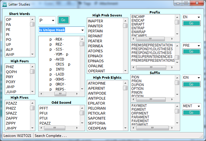 There is also a Custom list in Letter Studies, where you can select one of the searches to execute. One of the options is "Is Unique Hook", where words are displayed that include the letter as the ONLY hook. For the J, there is