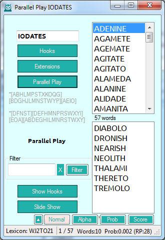 In a different search window (Front and Back) there are options to search for hooks and extensions, with front and back displayed in separate lists. The cool option in this search window is the Parallel search. This will simply show words that can be played parallel to the word entered. This could be most used following a high probability play with common (1 point) letters.