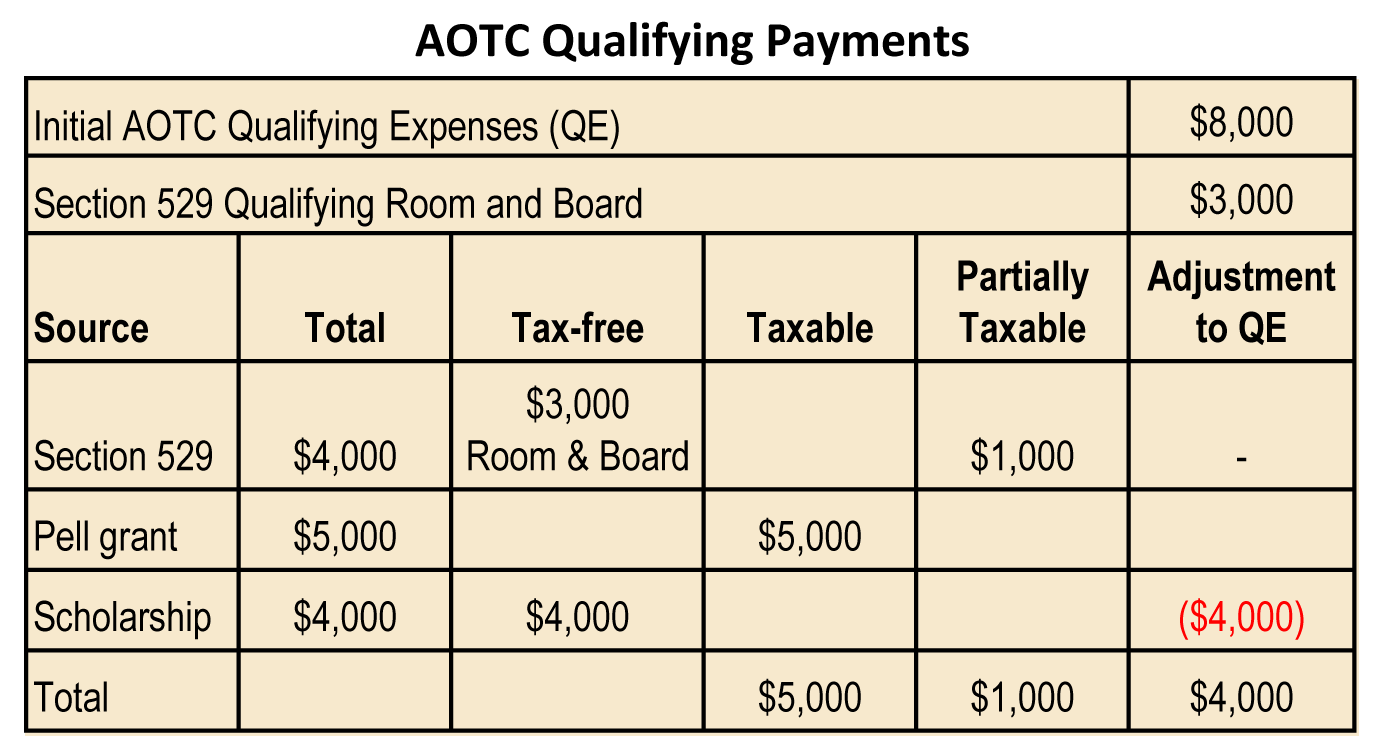 Just as taxpayers can coordinate their credit with scholarships, they can coordinate with other educational benefits with different qualifications. For example, room and board is a qualifying expense for Section 529, but not for AOTC. By systematically considering each benefit and making adjustments to qualifying expenses, it is possible to determine the best claiming strategy. Consider the following example: