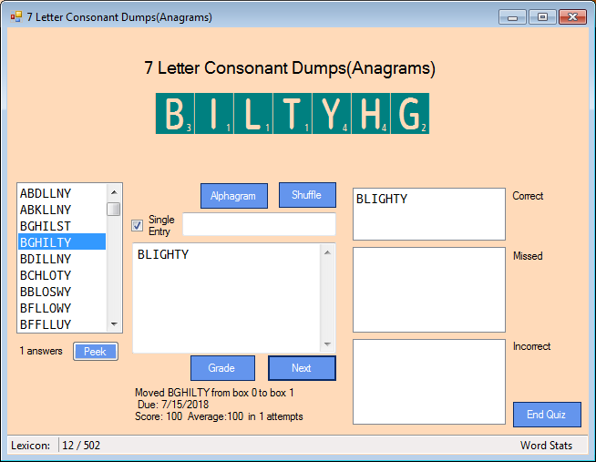 One difference between Hoot and Zyzzyva is that you can either enter words separately or in a box. Listed separately they are verified after each entry, and added to the list. The Grade button compares correct answers with your answers, and Next goes to the next word. However, Hoot examines the keystrokes so it's not necessary to use the buttons. In Single Entry mode, Hoot grades the quiz after a blank entry. In box mode, Hoot grades the quiz word after entering a blank line. Pressing Enter again goes to the next word.